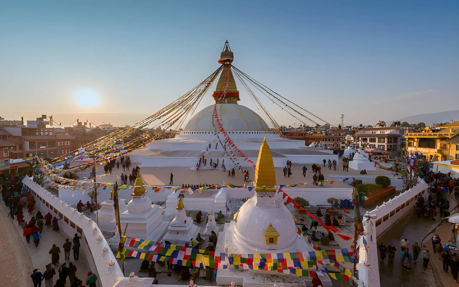 The massive white dome represents the universe, while the towering golden spire above it is adorned with the all-seeing eyes of Buddha, similar to Swayambhunath. Hundreds of prayer flags flutter in the wind, carrying mantras and prayers to the heavens. Monks, pilgrims, and locals walk clockwise around the stupa, spinning prayer wheels and chanting sacred texts, creating a deeply meditative atmosphere. The surrounding area is filled with monasteries, traditional shops, and rooftop cafés offering stunning views of the stupa.