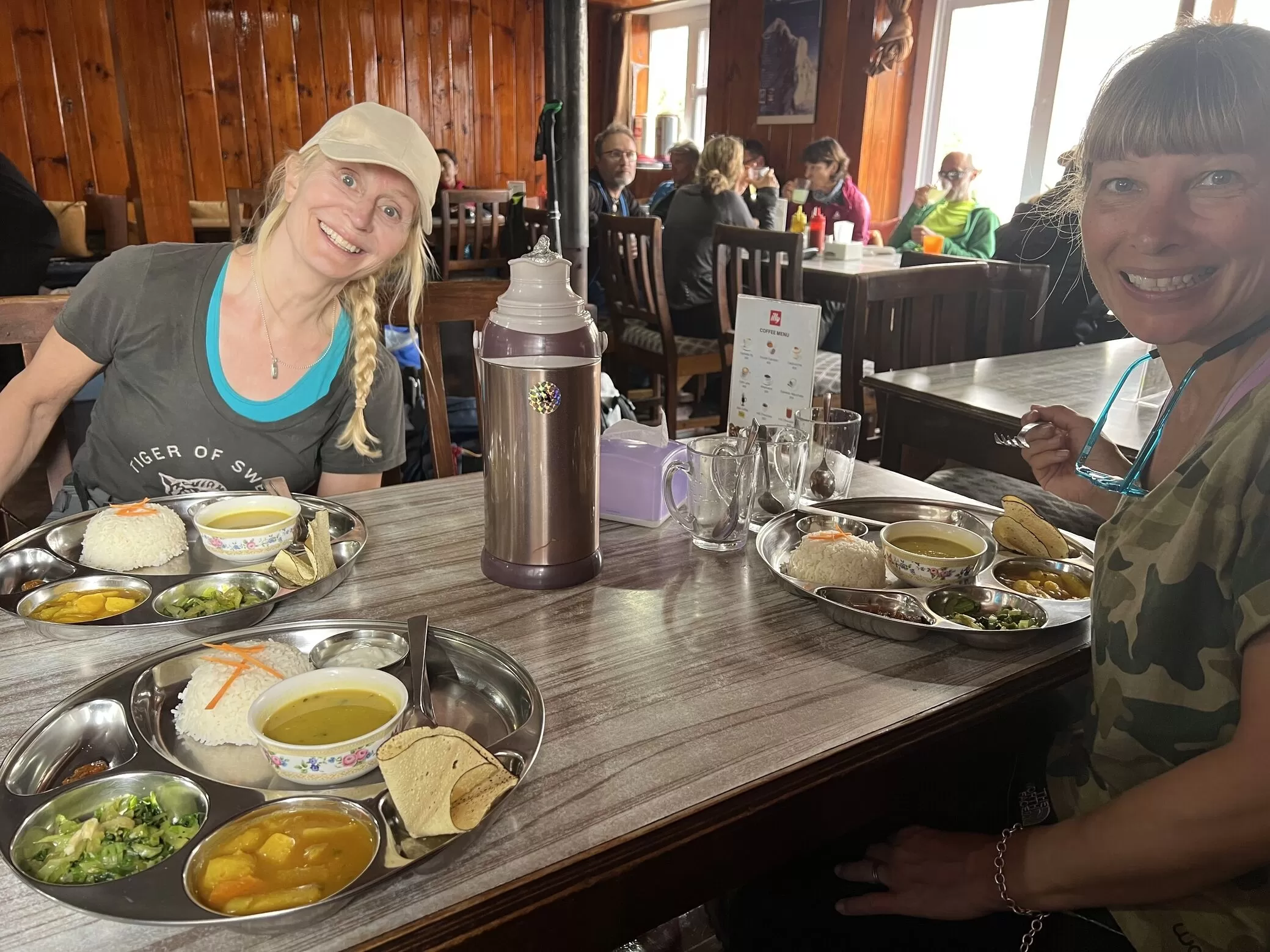 The standard menu in the Everest Region offers a mix of traditional Nepalese dishes such as Dal Bhat (lentil soup with rice), momo (dumplings), and thukpa (noodle soup), along with international options like pasta, pizza, and fried rice.