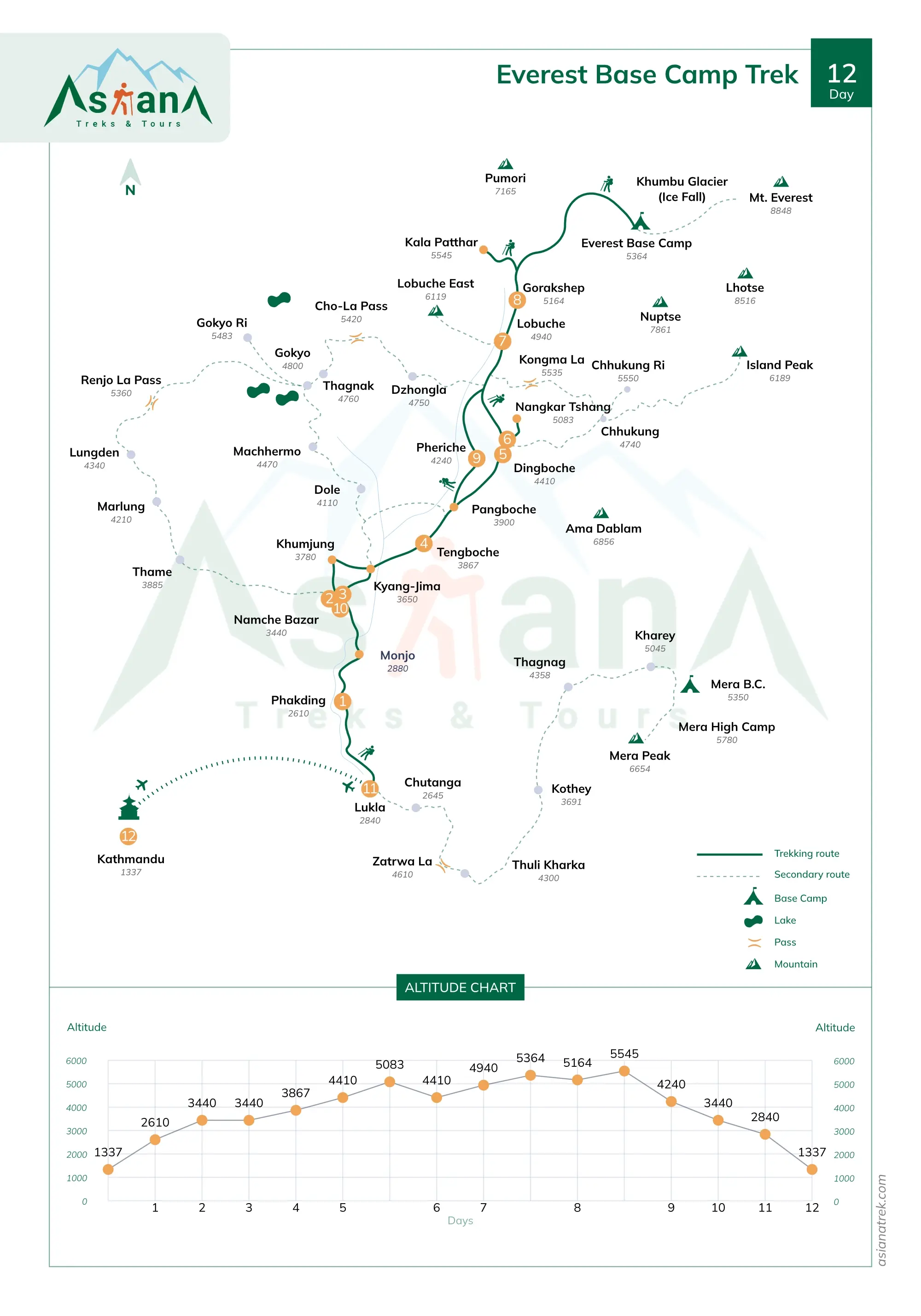 Elevation gain is significant: starting at Kathmandu’s altitude of roughly 1,400 meters (4,600 feet), trekkers gradually ascend to Everest Base Camp at 5,364 meters (17,598 feet). The highest point reached is Kala Patthar at 5,545 meters (18,192 feet), offering some of the best views of Mount Everest and surrounding peaks. The trekking stages range from short, easy walks to longer, more strenuous ascents with elevation gains of several hundred meters per day. This combination of distance, altitude, and rugged terrain makes the trek a moderately challenging adventure requiring good physical fitness. Asiana Treks and Tours structures the itinerary thoughtfully to maximise acclimatisation, comfort, and safety throughout the trek.