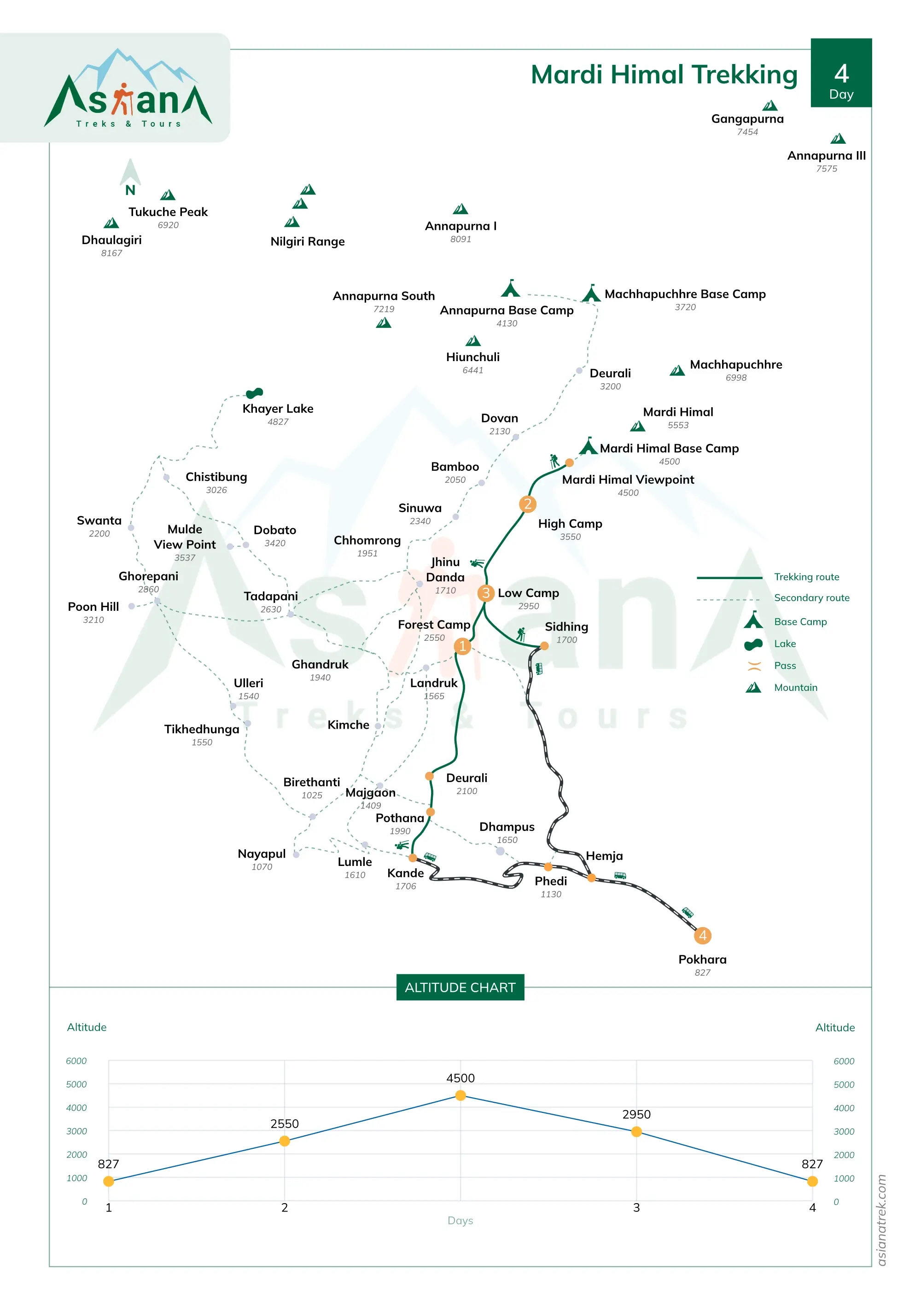 However, for trekkers with limited time, Asiana Treks and Tours offers a shorter, flexible 4-day Pokhara–Pokhara itinerary. The trek distance begins with a 27 km (17 miles) drive from Pokhara to Kande. From here, the trekking distance from Kande to Siding is about 44 km (27.3 miles), passing through Forest Camp, Low Camp, Badal Danda, High Camp, and Mardi Himal Viewpoint. The trek ends in Siding, followed by a 44–45 km (27 miles) drive back to Pokhara. In total, the complete round-trip distance is 71–72 km (44–45 miles), combining both walking and driving.